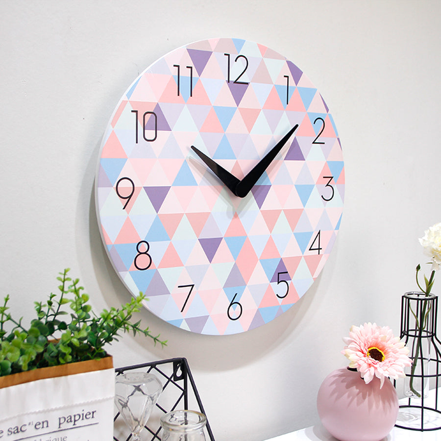 Onze design kinderklok is met zorg ontworpen, met oog voor zowel esthetiek als functionaliteit. De zachte, kalmerende kleuren en de eenvoudige, duidelijke cijfers maken het gemakkelijk voor kinderen om de tijd te leren lezen. Het geometrische patroon van roze, blauwe en paarse driehoeken is niet alleen visueel aantrekkelijk, maar stimuleert ook de creativiteit en verbeeldingskracht. Deze klok is meer dan alleen een tijdaanwijzer; het is een decoratief element dat de persoonlijkheid van de kamer van uw kind benadrukt. Het is stil en tikt niet, zodat de slaap van uw kind niet wordt verstoord.