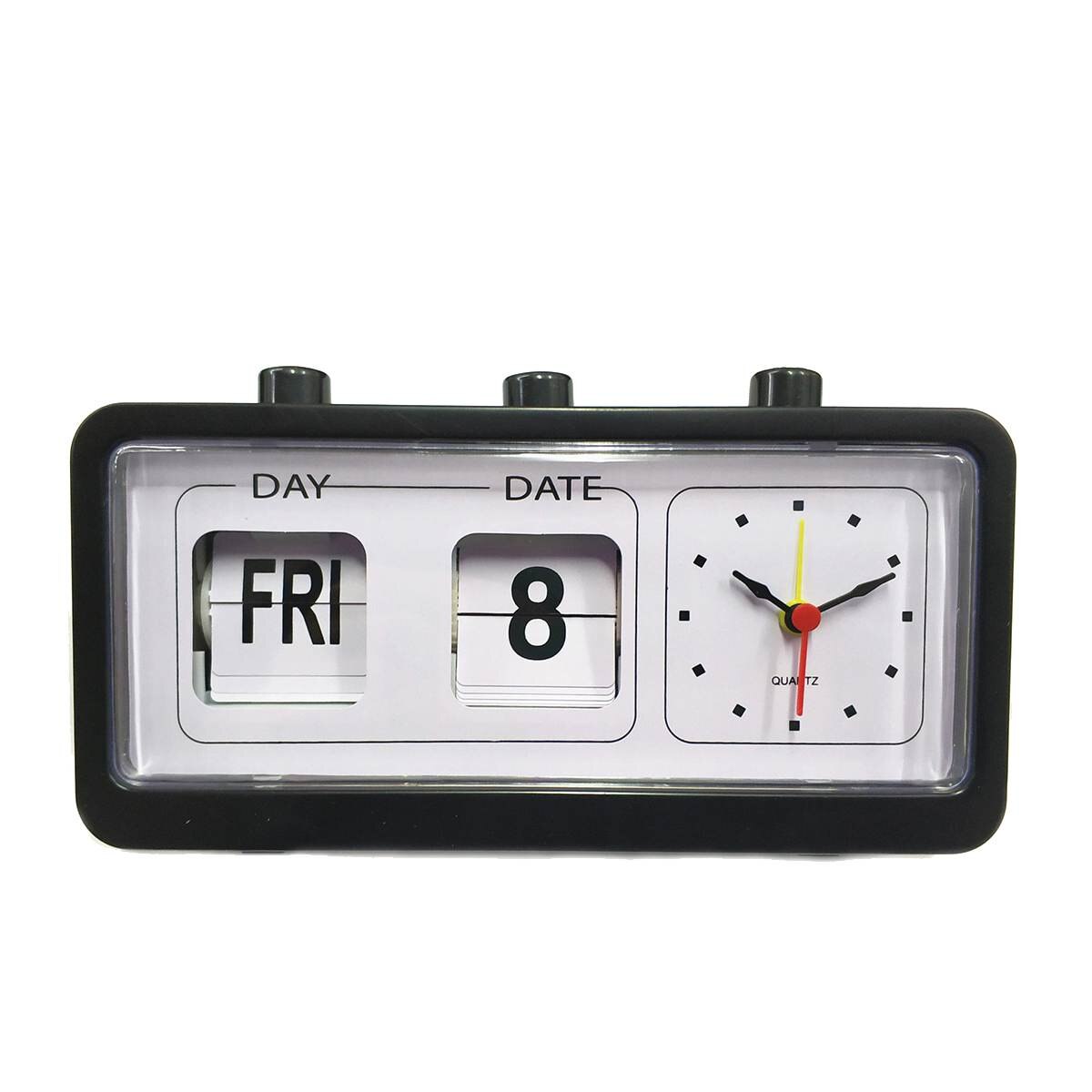 - Duidelijke weergave van de dag (bijv. FRI) en datum (bijv. 8) via flipmechanisme.