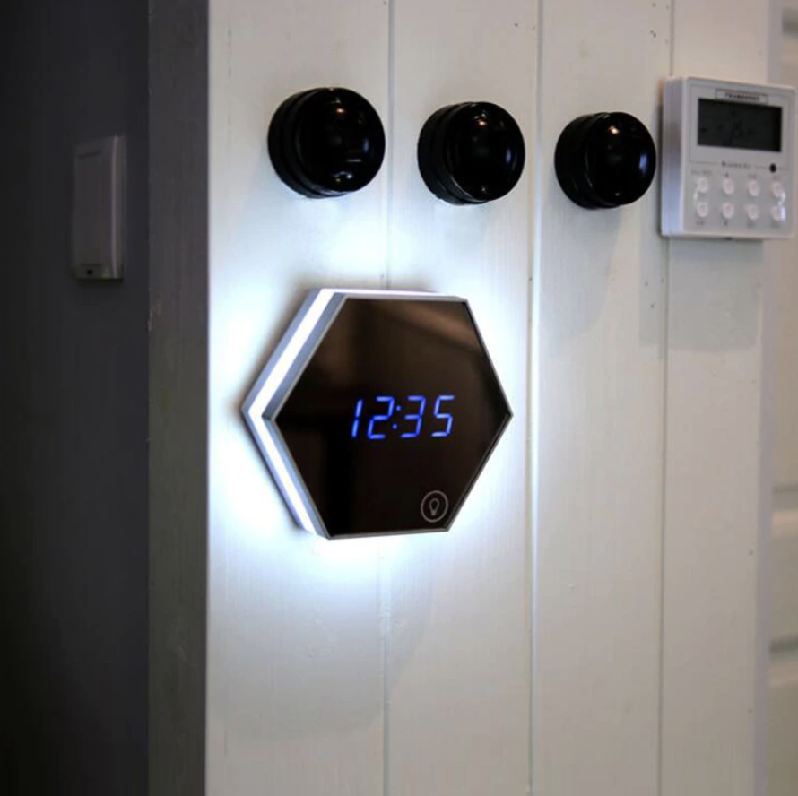 Verander de manier waarop je de tijd ervaart met onze futuristische digitale spiegelklok met LED. Dit is niet zomaar een klok; het is een stijlvol statement voor elke moderne ruimte. Stel je voor hoe deze elegante zeshoekige spiegelklok je slaapkamer, woonkamer of kantoor zal verrijken. Door zijn minimalistische design en heldere LED-display, geeft hij niet alleen de tijd weer, maar voegt hij ook een vleugje moderne klasse toe aan je interieur. Je zult versteld staan van de strakke lijnen en de subtiele spiegelafwerking die perfect past bij elke inrichting.