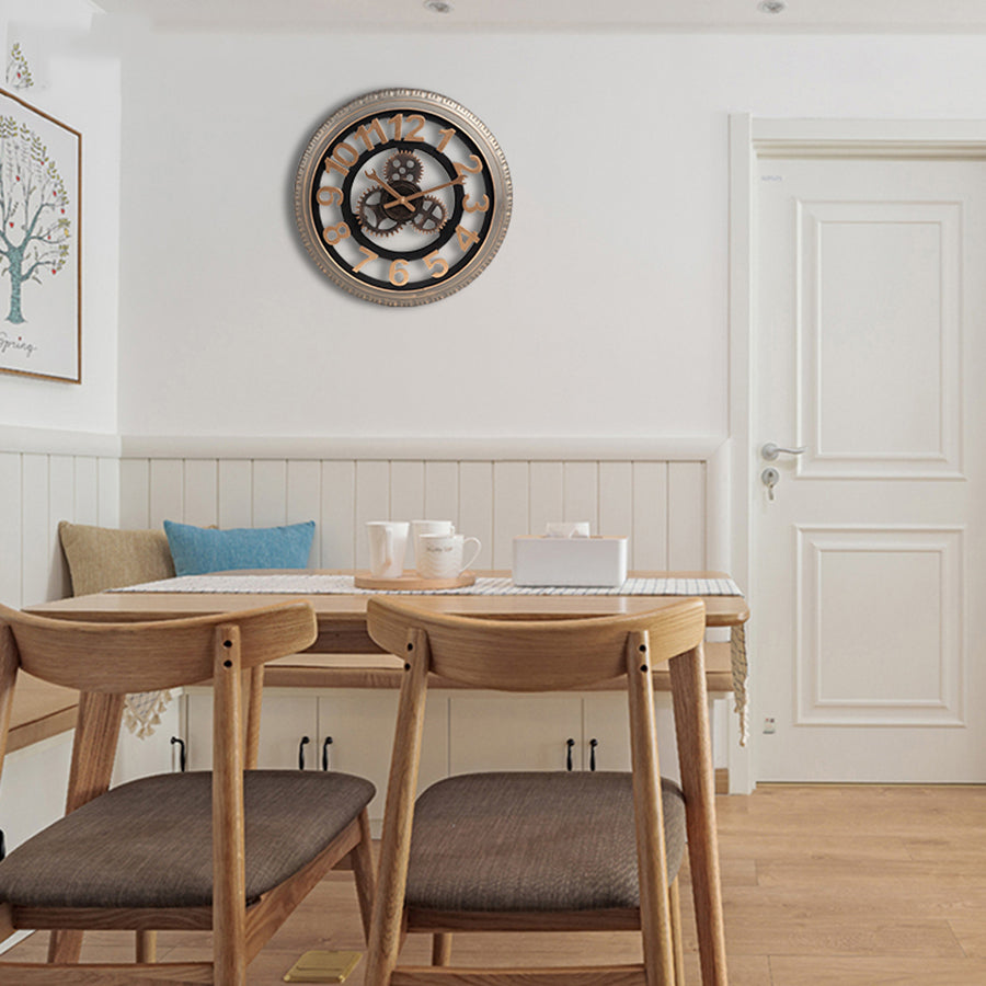 Deze wandklok is meer dan alleen een tijdmeter; het is een kunstwerk dat de industriële stijl ademt. Het unieke ontwerp, geïnspireerd op een wiel, geeft je ruimte direct een stoere en authentieke sfeer. De zichtbare tandwielen in het hart van de klok zijn een knipoog naar mechanische precisie en voegen een dynamisch element toe, terwijl de klassieke Romeinse cijfers zorgen voor een tijdloze elegantie. Het is de ideale combinatie van oud en nieuw, van ruw en verfijnd. Perfect voor een loft, een modern appartement met een rauw randje, of zelfs om een traditionele ruimte een onverwachte twist te geven. Deze industriële wandklok is ontworpen om indruk te maken en te inspireren.
