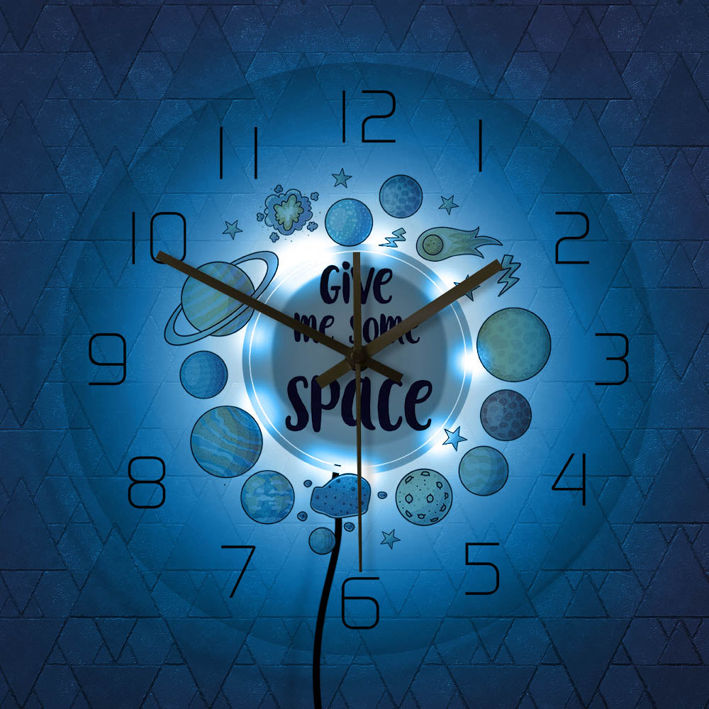 Breng de wonderen van het universum naar de kinderkamer met onze unieke wandklok met planeten. Deze vrolijke klok is niet zomaar een tijdsaanduider; het is een decoratief element dat de verbeelding van elk kind zal prikkelen. Met kleurrijke illustraties van planeten, sterren en kometen, en de speelse tekst "Give me some SPACE", is deze klok perfect voor kleine astronauten in spe. Hij helpt niet alleen bij het leren klokkijken, maar dient ook als een constante bron van inspiratie en avontuur. Geef de kinderkamer een extra dimensie van fun en educatie met deze betoverende wandklok.
